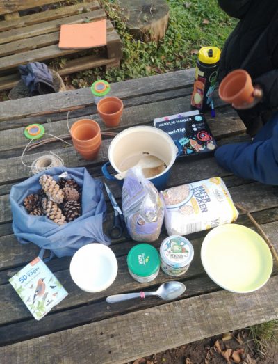 Nun ist der Winter da. Der kalte Wind zieht über unseren Garten hinweg und wir können ahnen, dass die Vögel im harten Boden nur noch wenig Nahrung finden. Da kommt uns eine Idee. Alte Kaffetassen, ein paar Zapfen, Kokosfett und Körnermischung zusammen suchen und los geht es. Wir schmilzen das Fett und rühren Körner ein. Alles schön miteinander verrühren und ab in die Tasse oder den Blumentopf. Stöckchen rein und alles abkühlen lassen. Mit einer Kordel werden die Tassen am Henkel aufgehängt- Auch die Zapfen werden eingefettet und nehmen am Baum Platz.