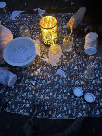 Ebenso entstehen Gläser, die wir mit bunten Schnipseln bekleben. Jedes Kind zündet sein eigenes Licht an und so manch eine*r staunt über die hell leuchtende Flamme.