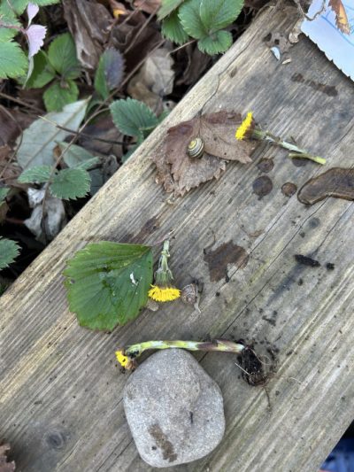 Im gesamten Garten haben sich zwischen Laub, Frühblühern, Totholz und Wintergemüse 6 Schnipsel versteckt. Gemeinsam ergeben sie ein Tier und einen Hinweis zum Schatz….