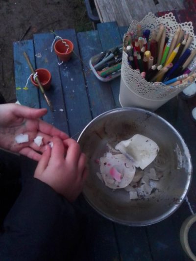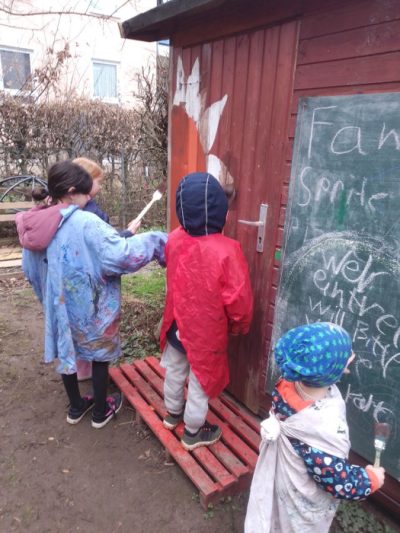 Zunächst begutachteten wir, welche Pflanzen den Winter überdauert haben. Sehr freuten wir uns darüber, dass die Stecklinge von Jostabeere und Boysenbeere gut angewachsen sind und bereits Blätter gebildet haben. Als nächstes wurden die Beete und Wege entkrautet, der Boden aufgeharkt und Radieschen, Möhren, Spinat und Eisssalat ausgesät. Bei den teilweise milden Temperaturen zeigten die Radieschen schon nach einer Woche bereits erste Keimblätter.