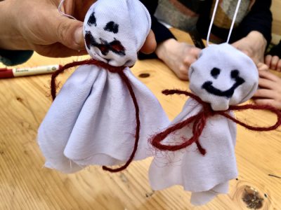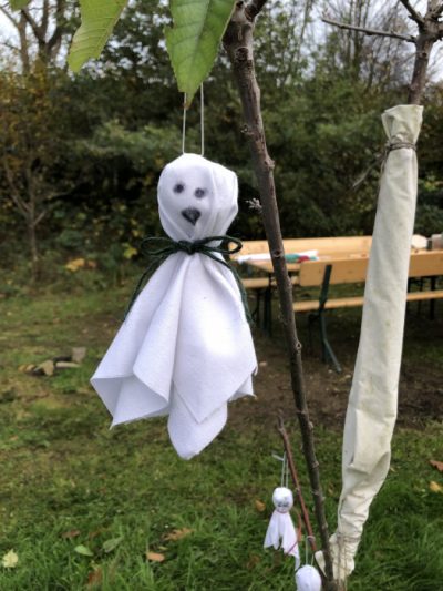 Bei unserem letzten Treffen vor Halloween wurde es gruselig im Gartentreff. Aus alten Tüchern und Zeitungspapier bastelten wir „liebe“ und „böse“ Gespenster, die die Kinder als Halloween-Deko mit nach Hause nehmen durfte.