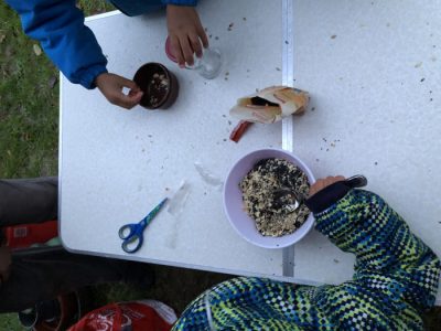 Heute haben wir ein Vogelfutterhäuschen „renoviert“ und Vogelfutter selbst zusammengemischt. Natürlich durften die Kinder die verwendeten Haferflocken, Rosinen und Co auch probieren. Unserem jüngsten Teilnehmer (2 Jahre) schmeckte es so gut, dass er das Futter lieber selbst essen wollte und die Schüssel erst einmal gar nicht mehr los ließ… Alle Kinder durften Vogelfutter mit nach Hause nehmen, um damit in der Gartentreff-freien Zeit, ab Dezember, immer wieder in den Garten zu kommen und die Vögel zu füttern.