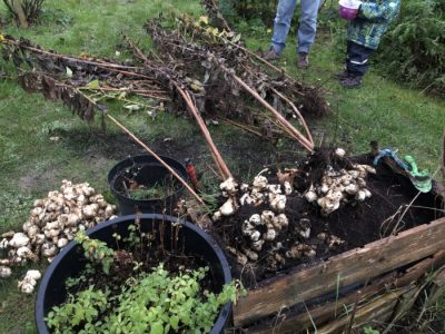 Vor den Sommerferien haben die Kartoffeln noch geblüht. Jetzt, nach unserer Ferienpause, geht’s ans ernten.. Wir holen mit großem Schatzsucher Ehrgeiz eine bunte Auswahl an „blauen Anneliesen“, rosafarbenen „Rosaras“, „Ernas“ und „Annabels“ aus der Erde 🙂