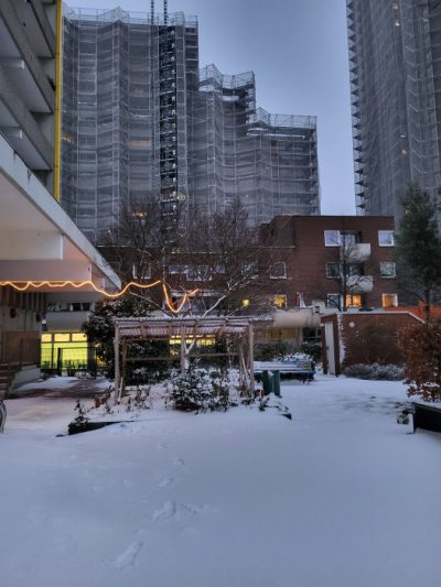 Chorweiler Mitte liegt an diesem Tag unter einem Hauch von Puderzucker. Kein schwerer Schnee, keine Last – eher ein zartes Versprechen. Die Dächer, Wege und Kanten tragen Weiß wie eine Erinnerung an Reinheit, an einen Neubeginn, der nichts fordert, sondern nur da ist. Alles scheint langsamer zu atmen.
