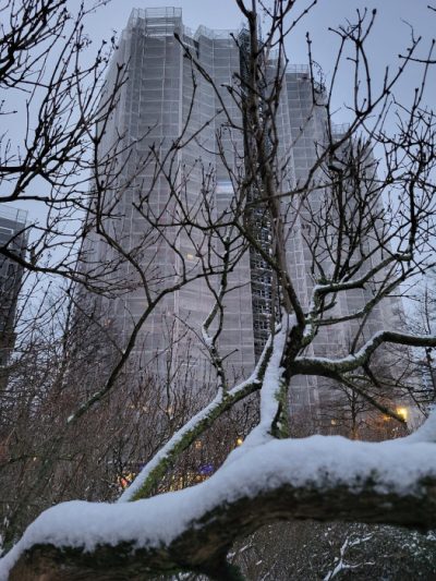 Die Geräusche sind gedämpft, als hätte die Zeit selbst einen Schal umgelegt. Schritte verlieren ihre Eile, Stimmen ihre Schärfe. Zwischen Beton und Glas entsteht ein Raum der Stille, der sonst selten sichtbar wird. Chorweiler, oft laut gedacht und vorschnell beurteilt, zeigt sich heute weich, beinahe verletzlich – und genau darin würdevoll.
