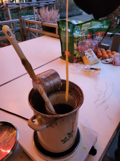 Jeder hatte die wunderbare Gelegenheit, seine eigene Kerze herzustellen – und damit sein ganz persönliches Licht. Mit viel Freude, Konzentration und leuchtenden Augen wurde immer und immer wieder der Kerzendort in Honig wachs eingetaucht. . Jede Kerze war so einzigartig wie der Mensch, der sie erschaffen hat. Es war schön zu sehen, wie Kinder und Erwachsene sich austauschten, lachten und sich gegenseitig halfen.