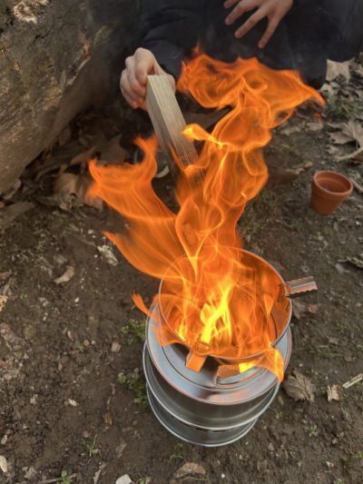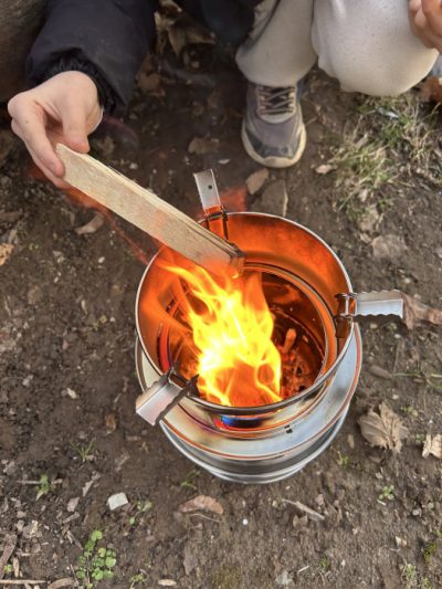 Es ist eisekalt. Um uns ein bisschen zu wärmen entfachen wir den Hobo-Ofen. Dazu bauen wir ihn erstmal zusammen, legen Zunder in den kleinen Ofen und drapierem dann das Anzündholz drumherum. Nun wird das Feuer entfacht und wir wärmen uns am Ofen. Wir entdecken getrocknete Kräuter im Lager und werfen einige davon auch ins Feuer. Mhhhh….das riecht wunderbar.