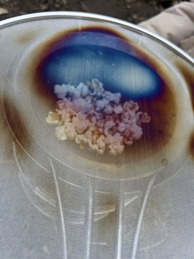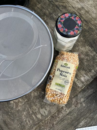 Aus einem Sieb und einem Tropfschutz bauen wir uns einen Popcorn-maker 🙂 Mal sehen ob es in den Flammen klappt. Ohhhh das stinkt. Alles verbrannt. Also nochmal. Am besten mit der Glut.