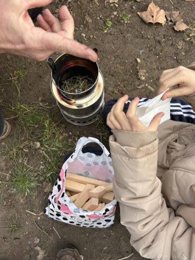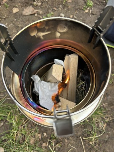 Bei kaltem Winterwetter mit etwas Sonne muss ein schönes Feuer im HOBO-Ofen her. Wie baut man den nochmal zusammen? Was eignet sich nochmal als Zunder? Wie stapeln wir das Holz am besten? Ein bisschen braucht es bis alles steht und das Feuer entfacht ist. Da wird uns wärmer. Schön!