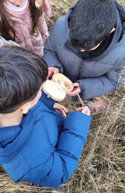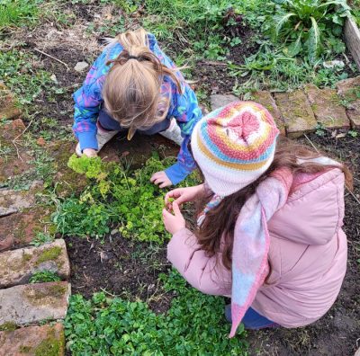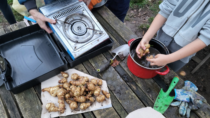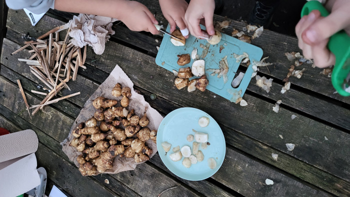 Im Januar gibt es für uns im Garten noch wenig zu tun. Ein paar Pflänzchen sprießen noch und einige Vögel haben sich an unserem Futter bedient. Aber es gibt auch noch etwas zu ernten! In unserem Beet ist so viel Topinambur gewachsen, dass wir es gar nicht geschafft haben vor der Winterpause alle Knollen auszubudelln. Also nochmal ran! Und was wir da noch alles finden! Es wird eine reiche Ernte und die Kinder schneiden und braten eifrig für die Chips – und am Ende ist alles aufgefuttert.