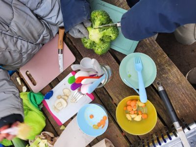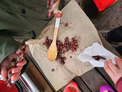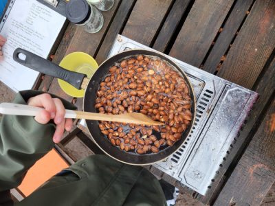 Die kalten Winternachmittage vertreiben wir uns mit der Zubereitung von Leckereien auf unserem Gaskocher. Von den zuckersüßen gebrannten Mandeln werden sogar Tütchen für die Kinder gepackt, die heute nicht dabei sein können.