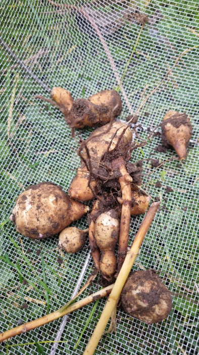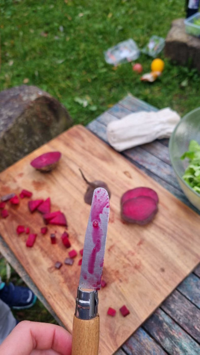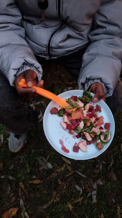Außerdem gibt es die erste Topinambur Ernte. Zusammen mit rote Beete, Orange, Datteln und Feldsalat zaubern wir einen leckeren Salat, der allen schmeckt!