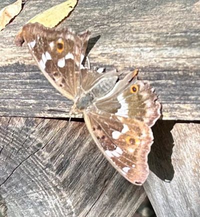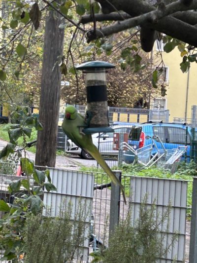 Nicht nur uns bot der GartenClub Nahrung. Wir konnten ein Weibchen von einem Kleinen Schillerfalter beim Lecken an Fallobst beobachten sowie Vögel wie Meisen und Halsbandsittiche an unseren Futtersilos. Im Hochbeet entdeckten wir eine Weinbergschnecke und ließen sie über unsere behandschuhten Hände kriechen. Wir lernten, dass sie sich überwiegend von abgestorbenen Pflanzenresten ernährt und im Garten kaum Schaden anrichtet. Im Gegenteil: Weinbergschnecken zersetzen ihre Nahrung und tragen somit zur Bodenverbesserung bei.