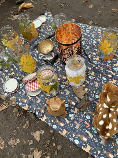 Immer gruseln sich noch viele vor Fledermäusen und so bastelten wir passend zu Halloween aus Kiefernzapfen diese flatterhaften Tiere und mischten uns einen blutroten „Fledermauscocktail“ – auch wenn von weltweit mehr als 1.400 vorkommenden Fledermausarten nur drei Arten Blut trinken. Dass Fledermäuse mit ihren Händen fliegen und mit ihren Ohren sehen, faszinierte uns sehr. So versuchten wir uns ebenfalls im Dunkeln mit unseren Ohren im Gartenclub zu orientieren und spielten im Dunkeln Versteckfangen. Lachen, Rufe und Rascheln verrieten dem Fänger dabei die Verstecke der anderen.