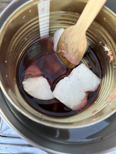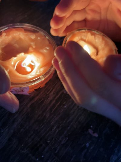 In einem Wasserbad wurden sie dann auf dem Gasherd geschmolzen und nach einigem Warten und Rühren hatten sie sich kompett aufgelöst. Das Wachs füllten wir vorsichtig in die kleinen Gläschen. Nur noch einen Docht in das flüssige Wachs reingehalten – ta da: fertig sind die neuen Kerzen. Diese verschönern nun jeden Esstisch an Weihnachten.