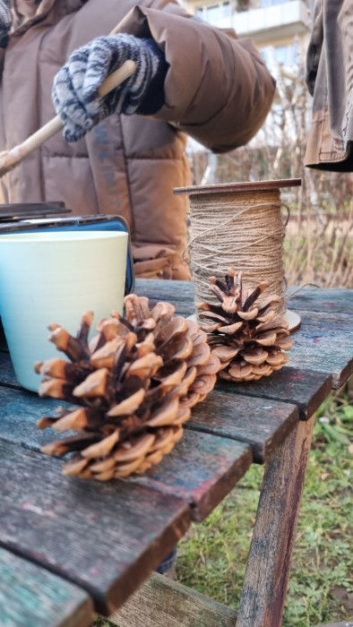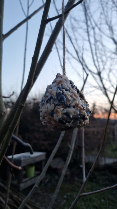 Wir locken die Vögel in unseren Garten und hängen Futterzapfen für sie in die Bäume.